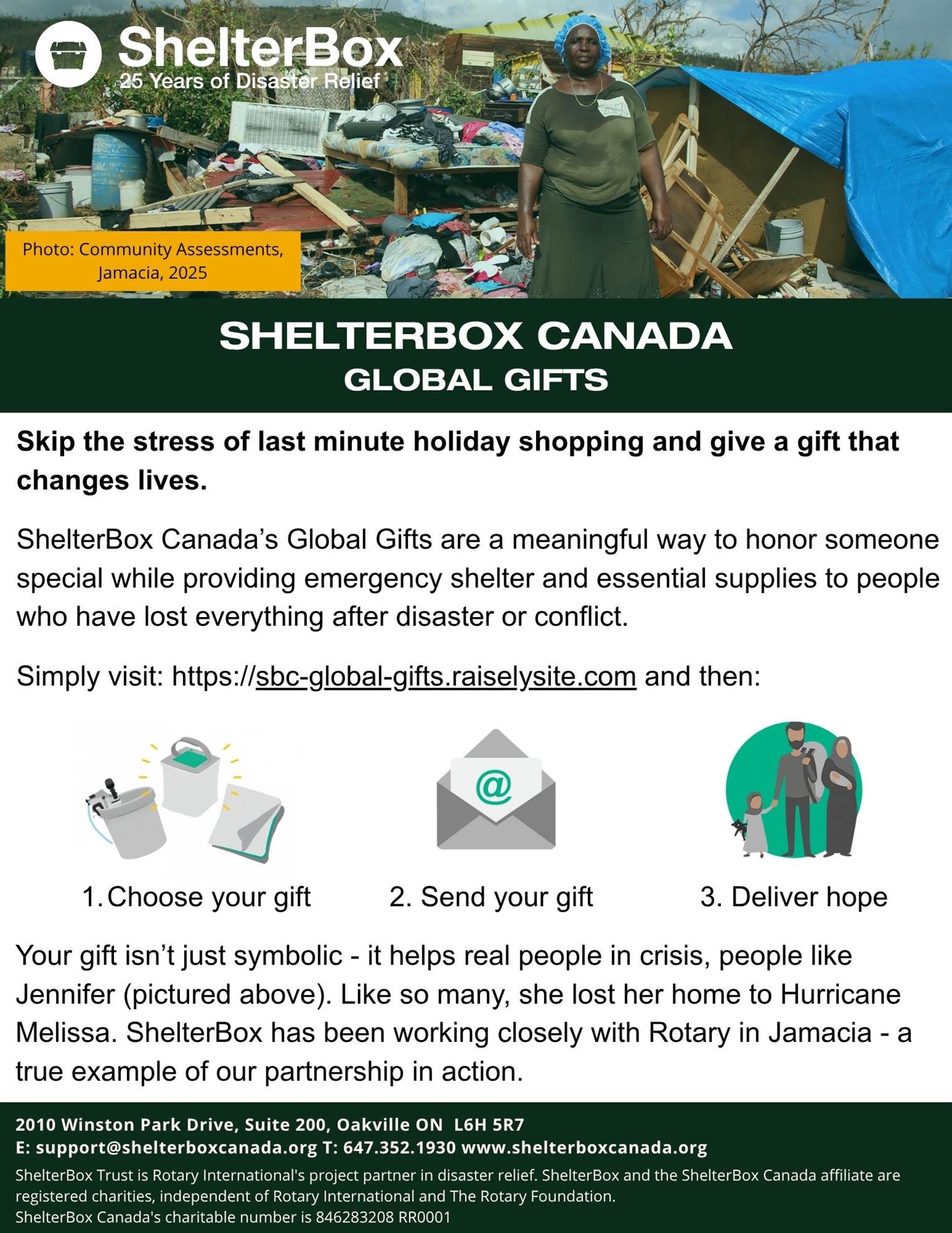 Donate directly to Shelter Box Canada (www.shelterboxCanada.org/gifts), 1-855-875-4661